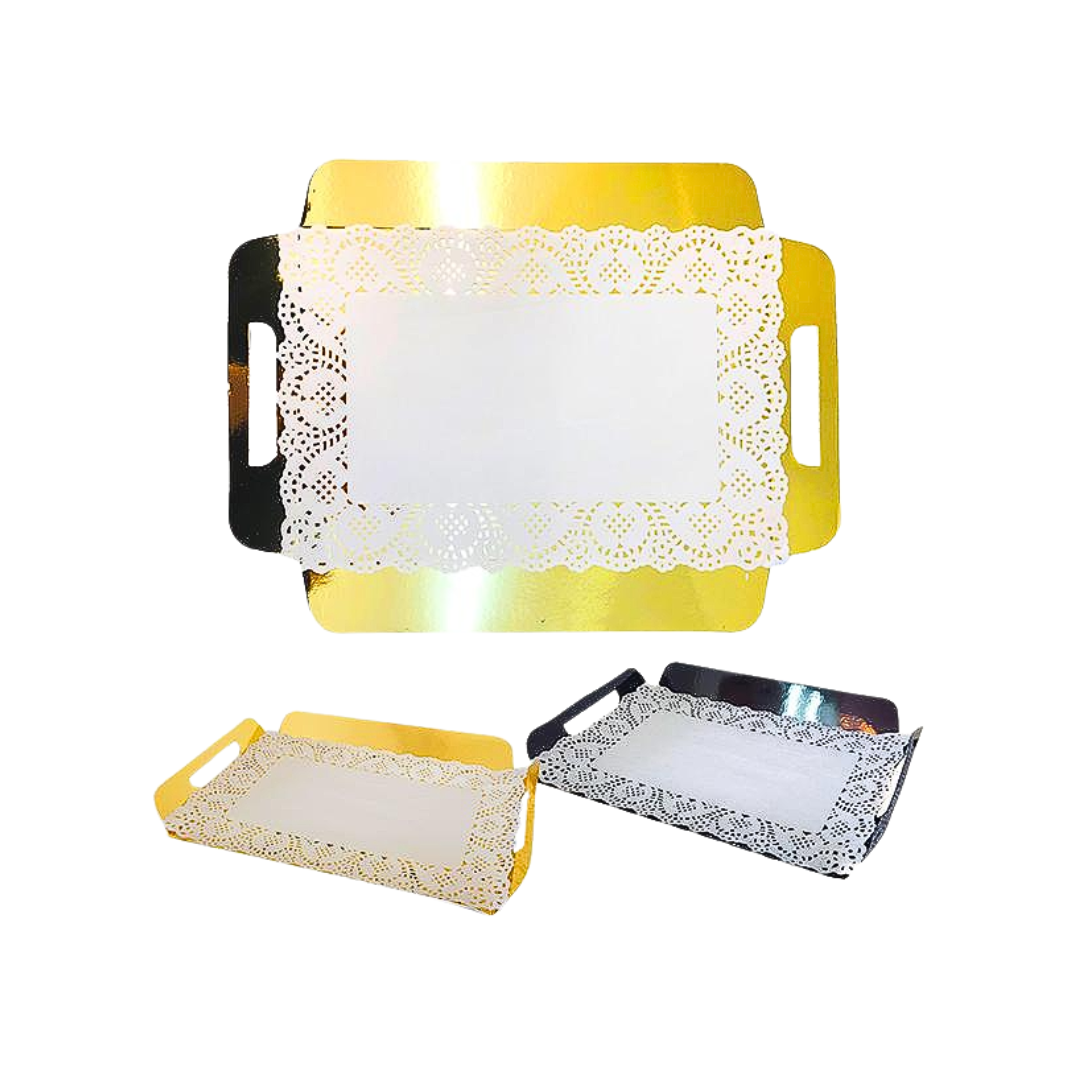 Bandeja con asas en color dorado con una medida aproximada de 30 x 40 cm, el empaque incluye su blonda