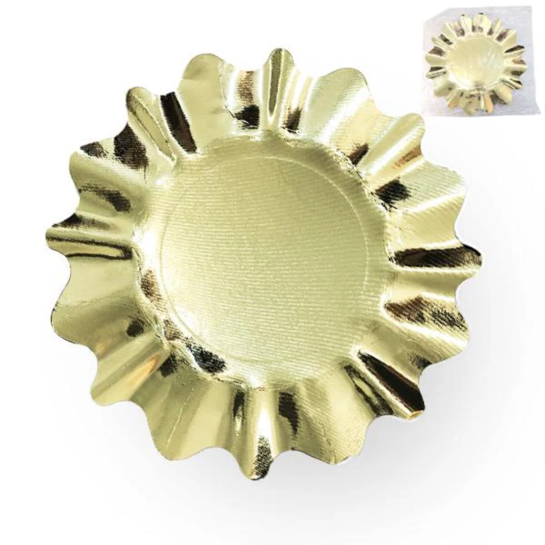 Bandeja dorada con ondas con una medida aproximada de 30cm. Ideal para tortas o snacks