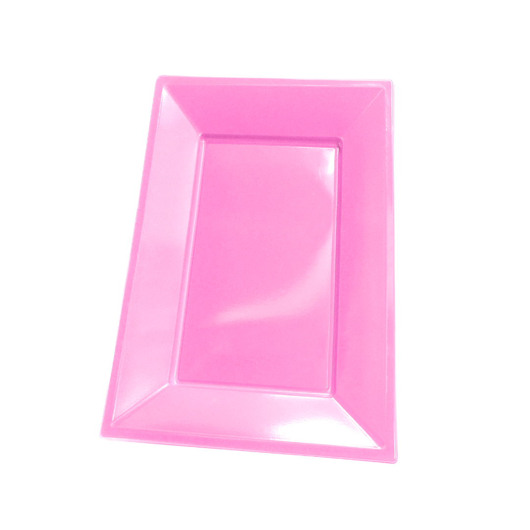 Bandeja rectangular rosada con una medida aproximada de 33x23cm, el empaque contiene 3 unidades
