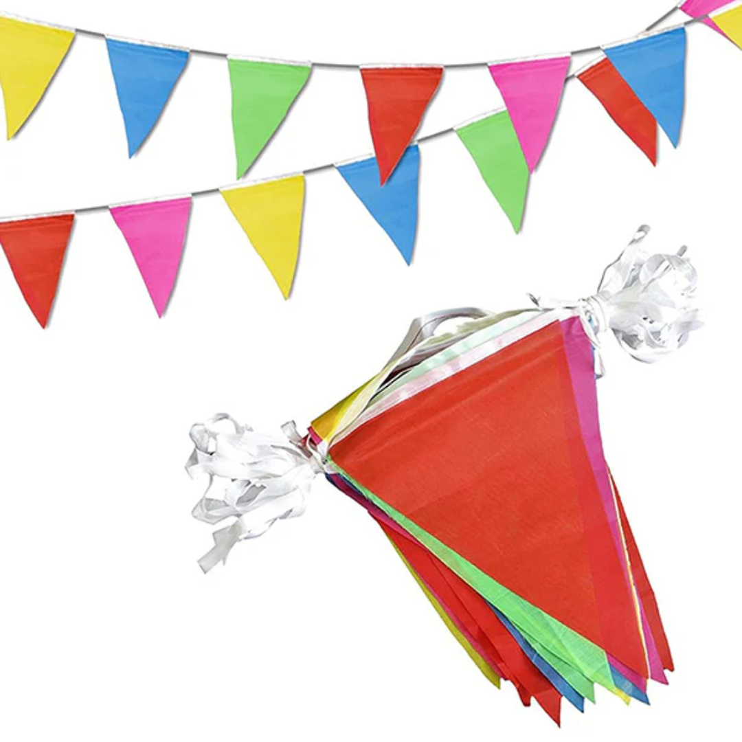 Banderín de tela con 25 triángulos decorativos, ideal para fiestas y celebraciones. Cada triángulo mide 23 x 13.5 cm, y el largo total del banderín es de aproximadamente 7 metros. Fabricado con materiales resistentes y reutilizables, aporta un toque colorido y festivo a cualquier evento.
