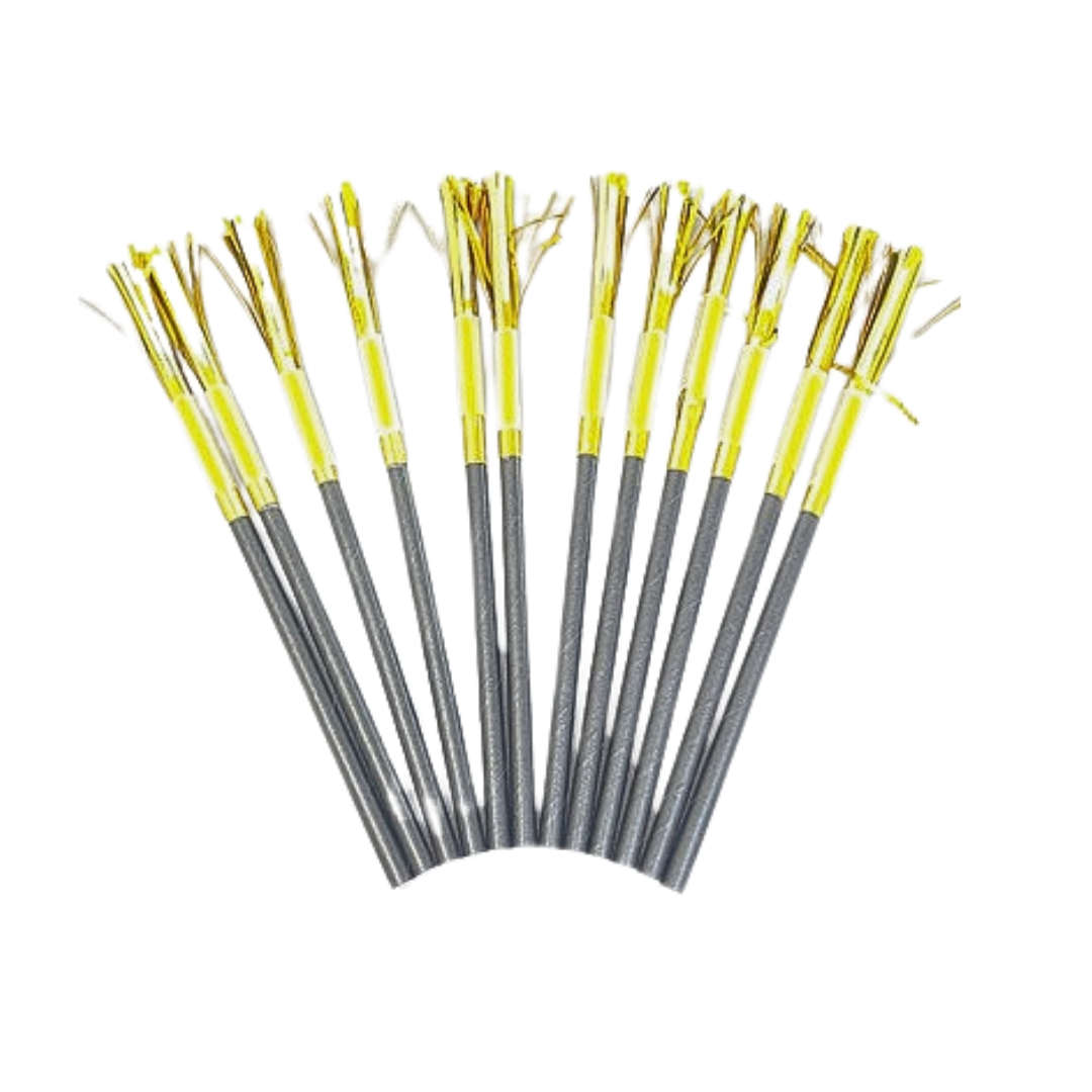 Bombillas negras con flecos dorados, el empaque contiene 12 unidades
