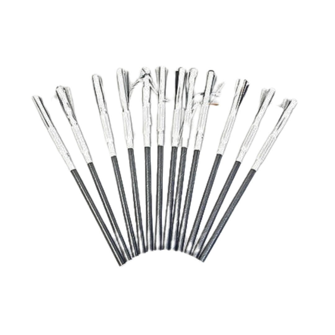 Bombillas negras con flecos plateados, el empaque contiene 12 unidades