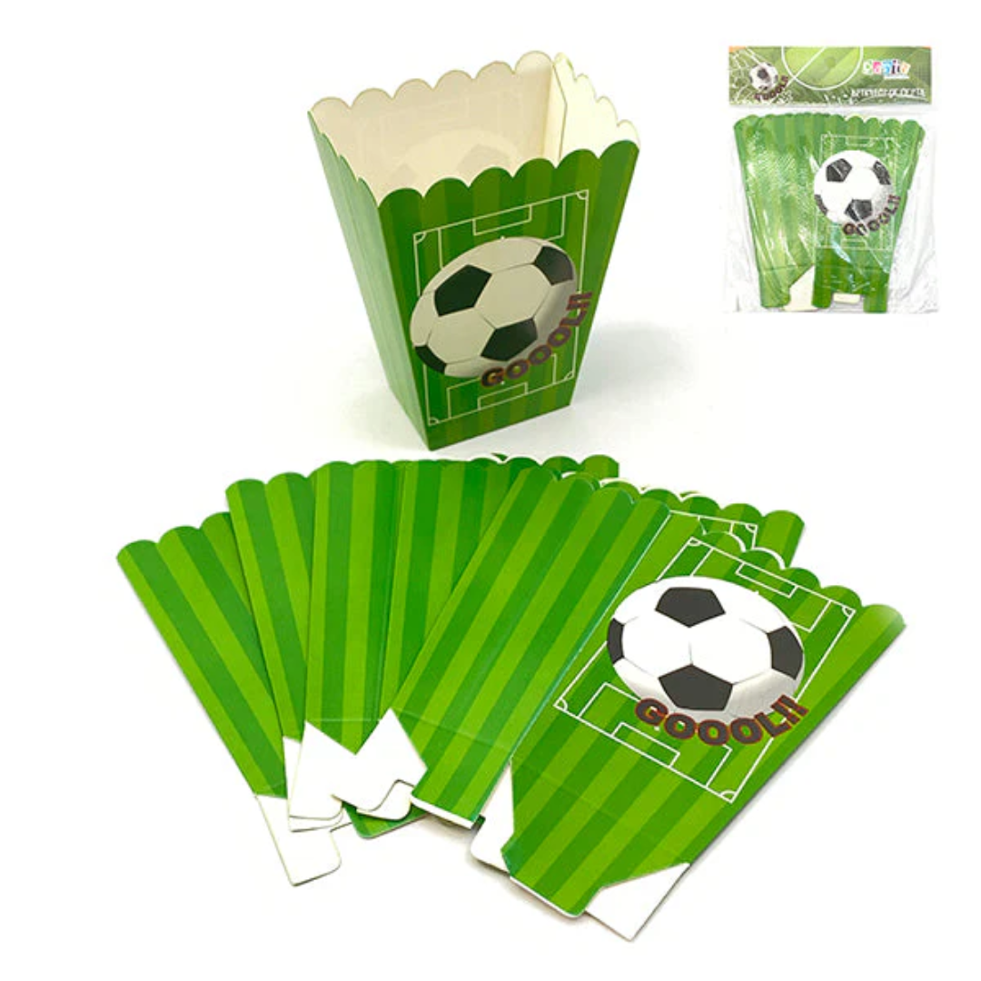 Esta caja para pop corn es ideal para tus celebraciones, tiene una medida aproximada de 13x9cm armada, con un diseño de fútbol, el empaque contiene 6 unidades