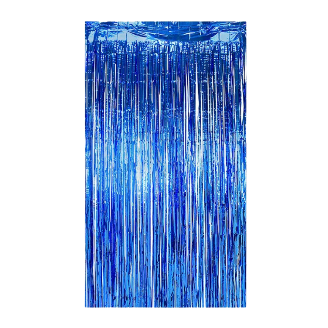 Cortina metalizada azul, con una medida aproximada de 2x1mt