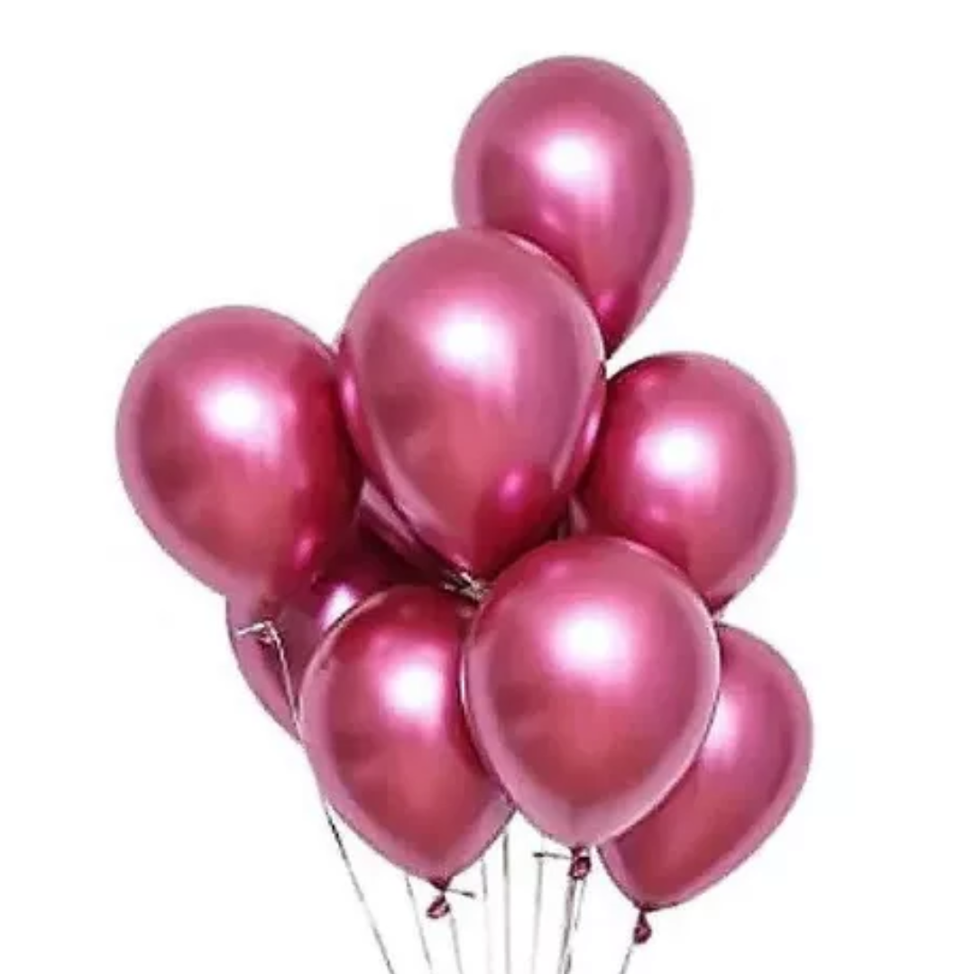 El Globo R12 Chrome fucsia es un globo de látex con un acabado metálico cromado en color fucsia. Tiene un tamaño de 12 pulgadas (aproximadamente 30 cm) cuando está inflado y viene en un paquete de 25 unidades.