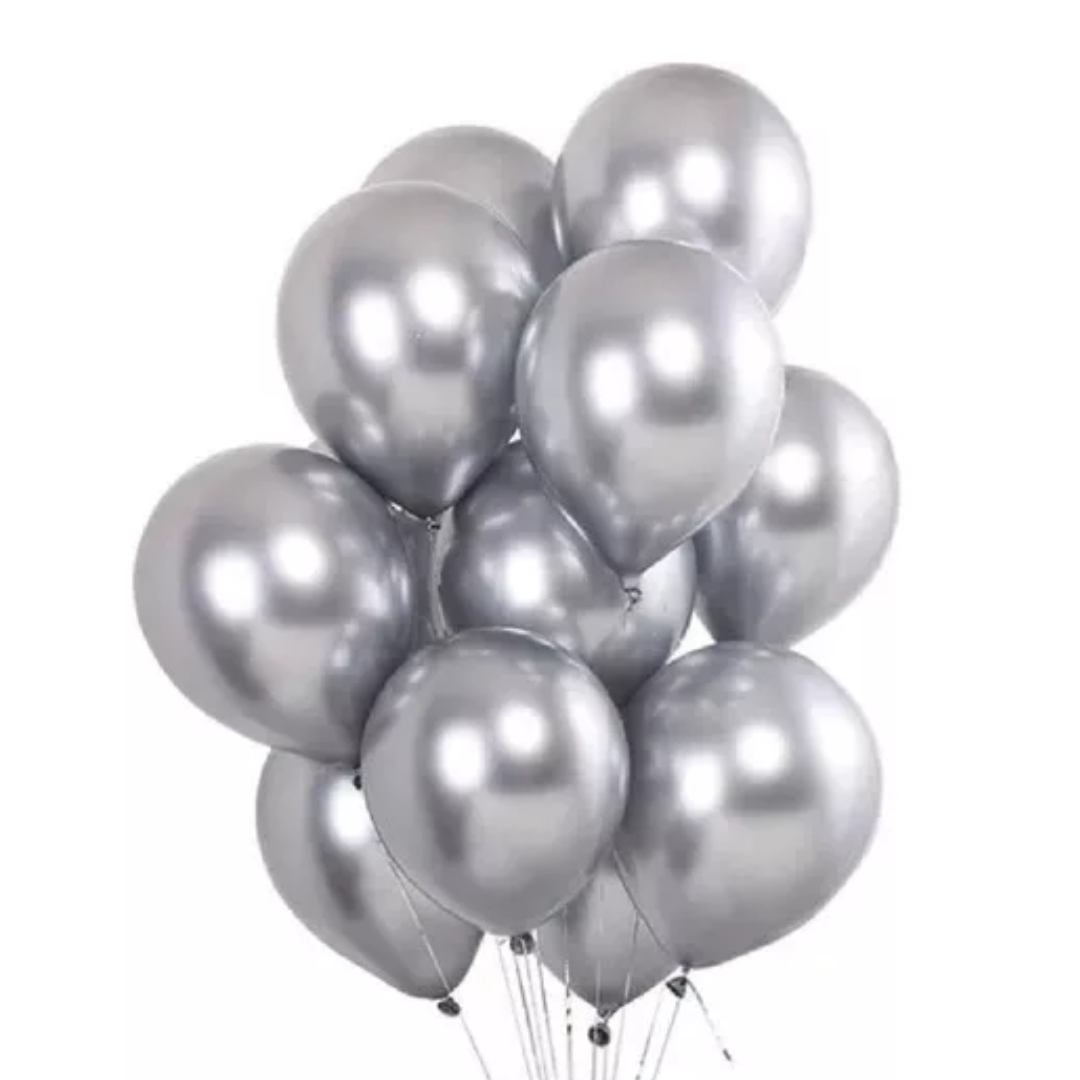 El Globo R12 Chrome Plateado es un globo de látex con un acabado metálico cromado en color plateado. Tiene un tamaño de 12 pulgadas (aproximadamente 30 cm) cuando está inflado y viene en un paquete de 12 unidades.