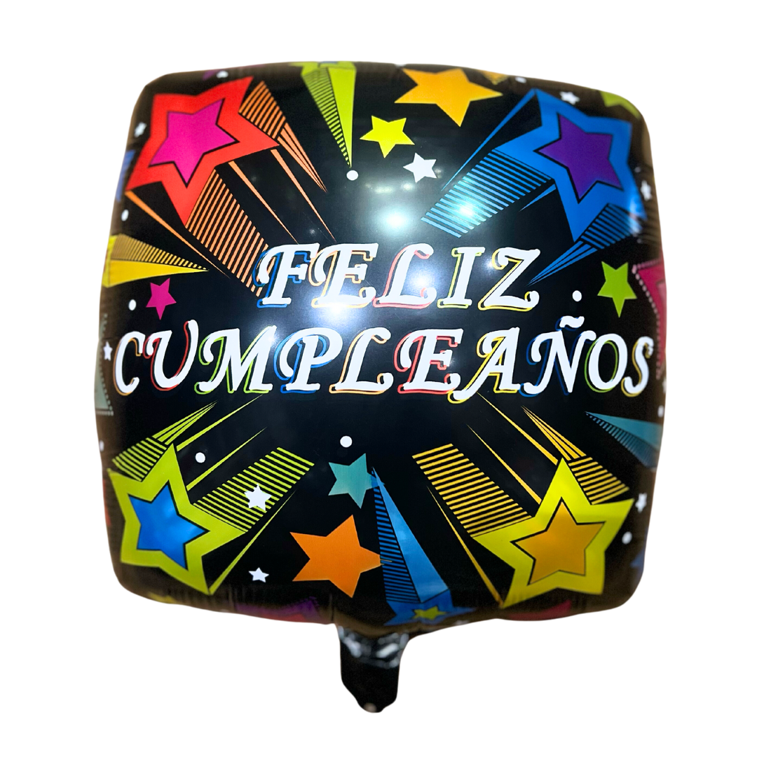 Este globo en forma de cuadrado es ideal para celebrar cumpleaños, su medida aproximada es de 18 pulgadas o 45cm, es de color negro con el texto feliz cumpleaños y diseño de estrellas, este producto no cuenta con su empaque individual y no incluye varilla