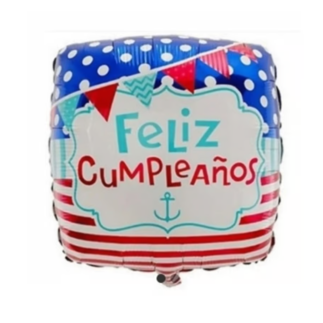 Este globo en forma de cuadrado es ideal para celebrar cumpleaños, su medida aproximada es de 18 pulgadas o 45cm, es de color azul con el texto feliz cumpleaños y diseño de bandera o marinero, este producto no cuenta con su empaque individual y no incluye varilla