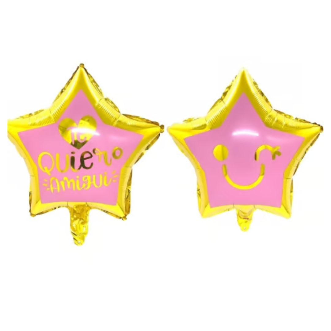 Este globo en forma de estrella es ideal para todo tipo de celebraciones, su medida aproximada es de 45cm, es de color dorado y rosado, con una carita y el texto te quiero amigui. este producto no cuenta con su empaque individual y no incluye varilla