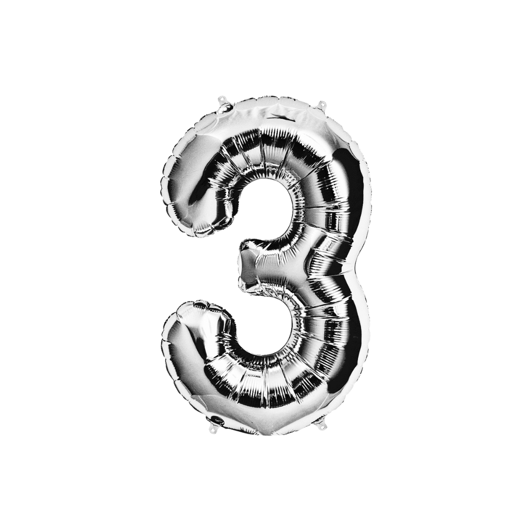 Globo metalizado número 3 color plateado, el empaque contiene 1 unidad con una medida de 32 pulgadas aproximadamente 80cm, este producto es ideal para destacar en tu fiesta