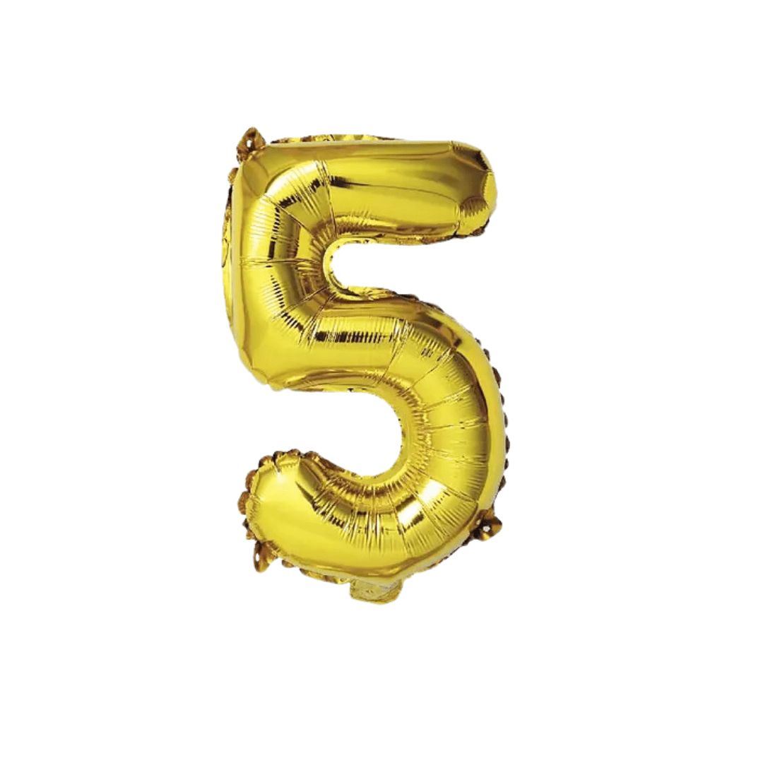 Globo metalizado número 5 color dorado, el empaque contiene 1 unidad con una medida de 32 pulgadas aproximadamente 80cm, este producto es ideal para destacar en tu fiesta