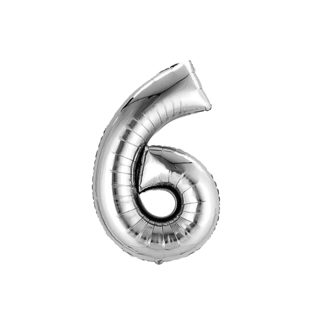 Globo metalizado número 6 color plateado, el empaque contiene 1 unidad con una medida de 32 pulgadas aproximadamente 80cm, este producto es ideal para destacar en tu fiesta