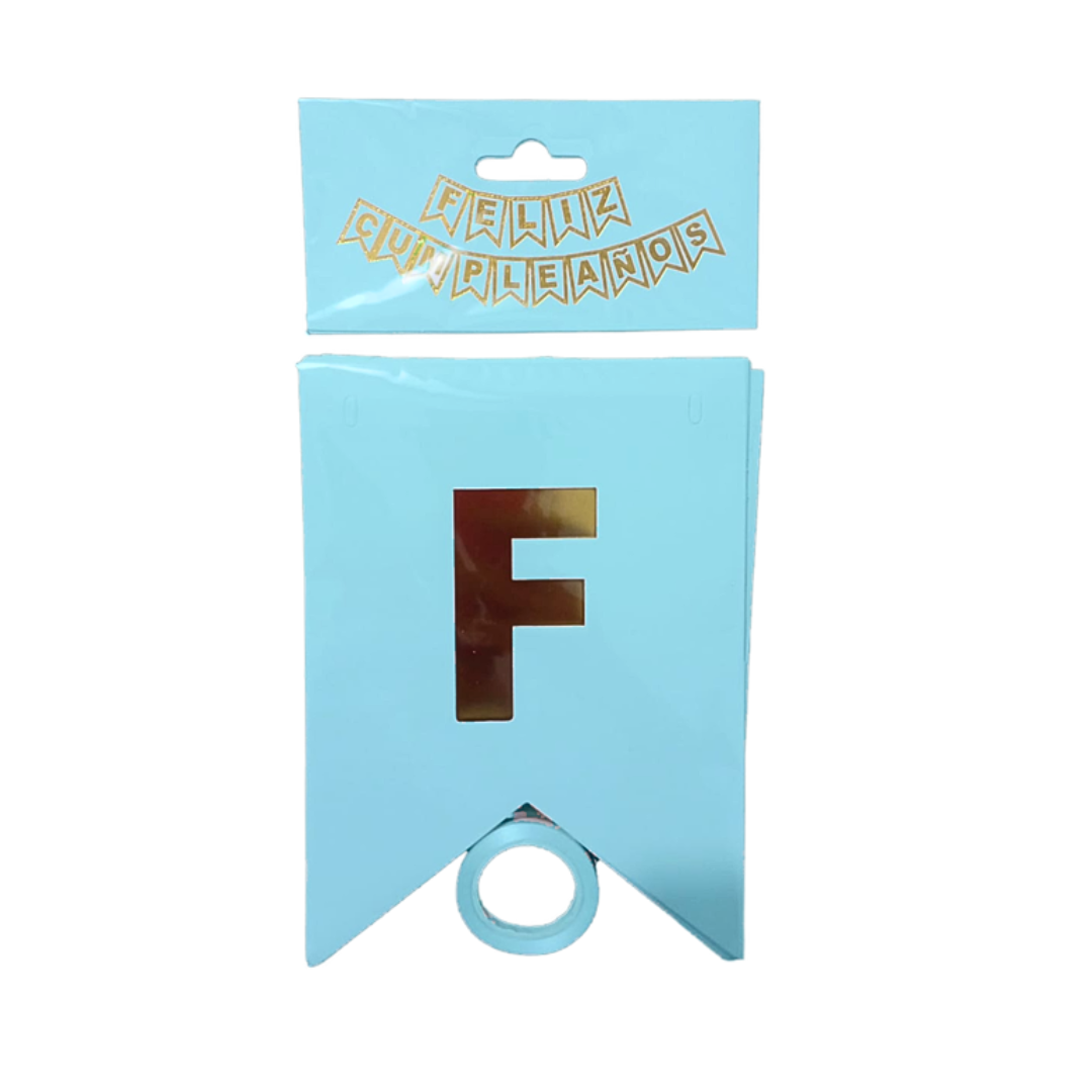 Hermosa guirnalda con la letras doradas feliz cumpleaños, el fondo en color celeste