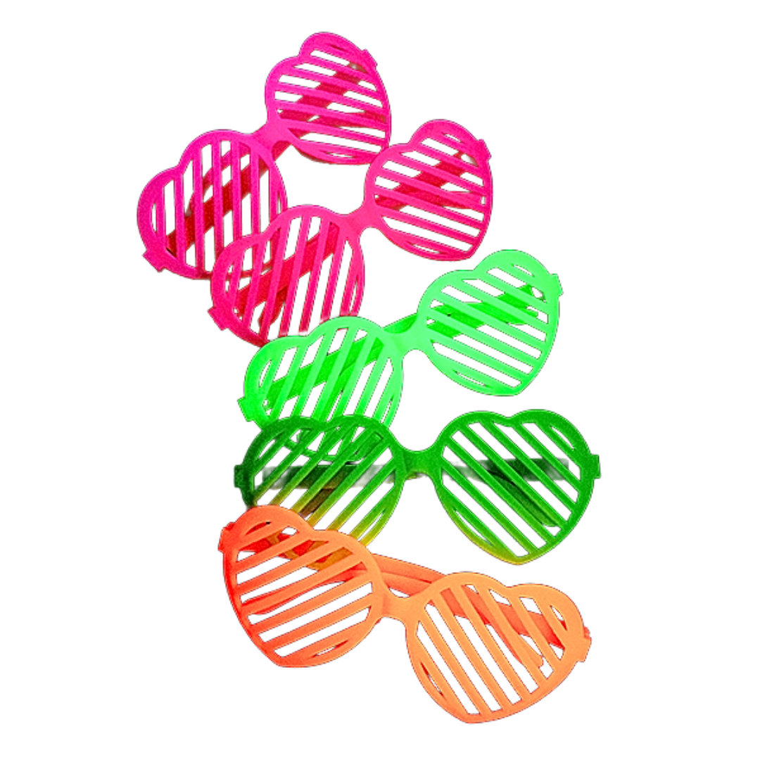 Los Lentes Flúor corazones vienen en un paquete de 5 unidades, diseñados con colores neón vibrantes y un divertido formato de corazón. Son ideales para fiestas, celebraciones y eventos, agregando un toque llamativo y festivo. Fabricados en material ligero y resistente, ofrecen comodidad y durabilidad. 🌟🕶️