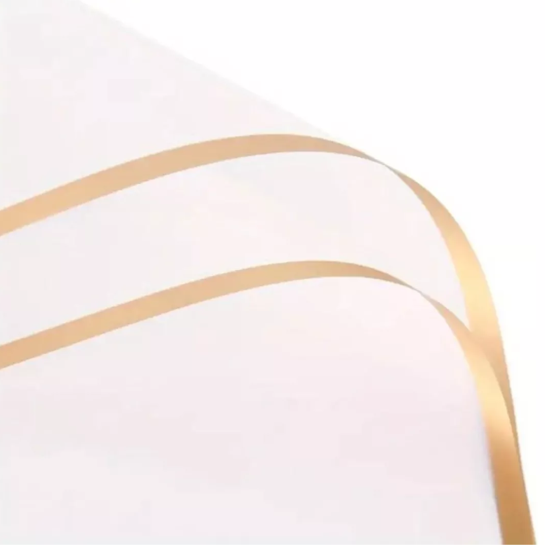 Papel coreano color blanco con borde dorado, el empaque contiene 20 unidades de una medida aproximada 57x57cm