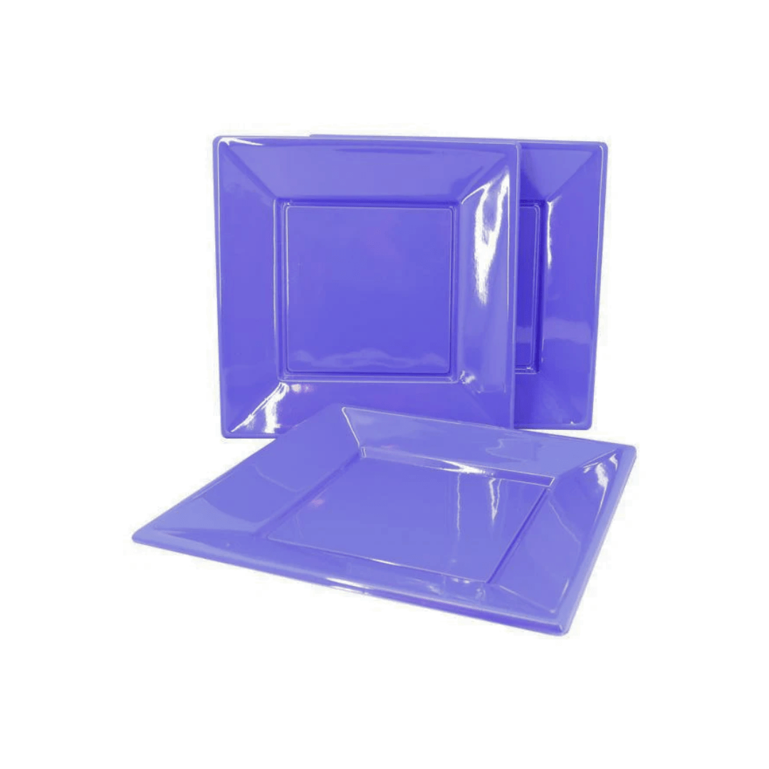 Estos platos miden 18cm, su color es un morado más claro y el empaque contiene 10 unidades. Puedes hacer la diferencia con estos hermosos platos cuadrados que salen de lo tradicional