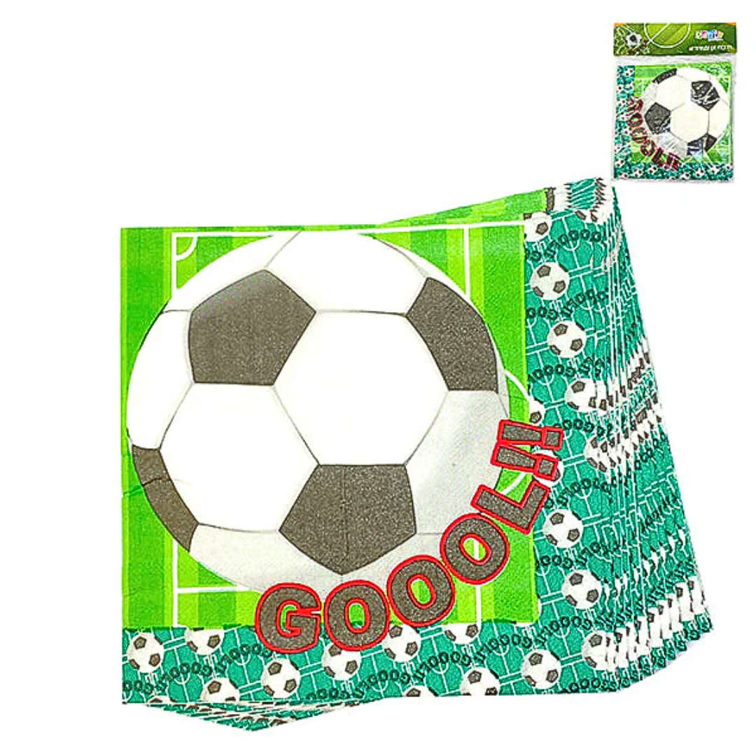 Estas servilletas temáticas de fútbol son perfectas para fiestas y eventos deportivos. Con diseño en sus cuatro caras, ofrecen un toque dinámico y divertido a la decoración. Están hechas de papel resistente y absorbente, ideales para un uso cómodo. El pack incluye 12 unidades y su tamaño es estándar, adaptándose a cualquier ocasión.