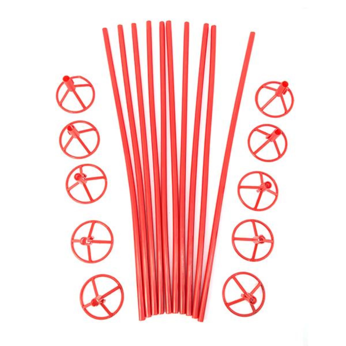Varillas porta globos metálicos, estas varillas se utilizan habitualmente para globos metalizados o globos foil, el empaque contiene 10 unidades incluyendo la varilla y el canasto en color rojo, las varillas miden aproximadamente 40cm y un diámetro de 8mm, no se considera canasto en la medida