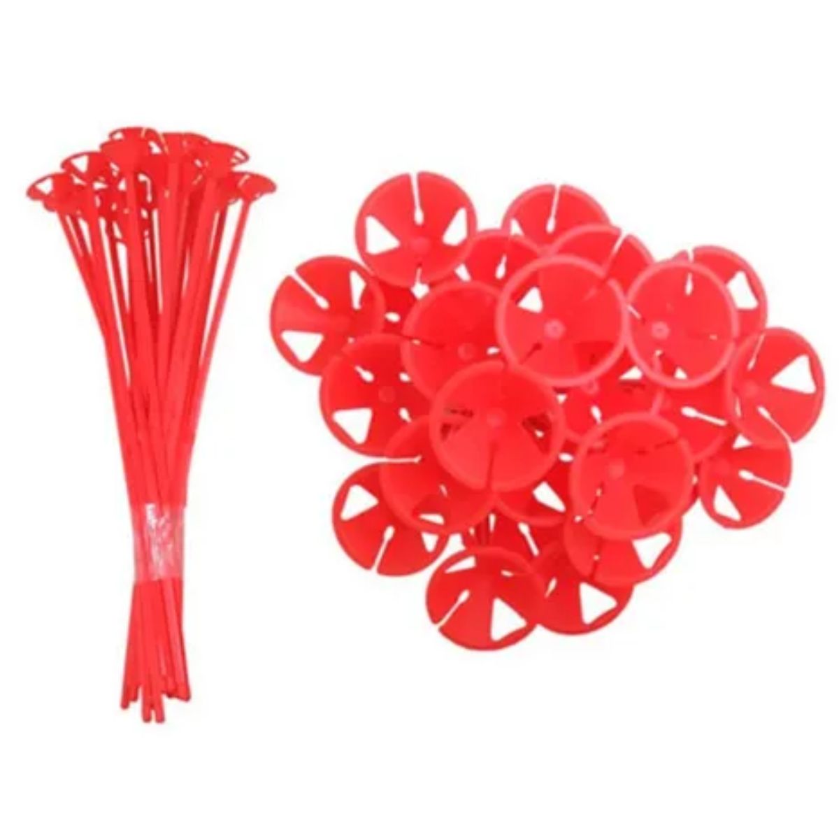 Este pack de varillas rojas delgadas, son principalmente usadas en globos látex, el empaque contiene 100 unidades con un largo aproximado de 40cm y cada varilla incluye su canasto