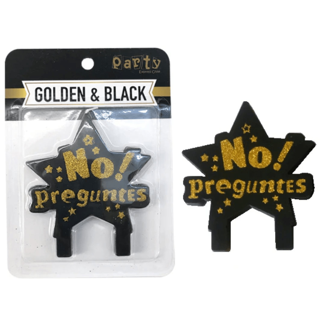Vela no preguntes, color negro con letras doradas, es una hermosa opción para decorar tu torta de cumpleaños, el empaque contiene 1 unidad con una medida aproximada de 9,5 x 8cm
