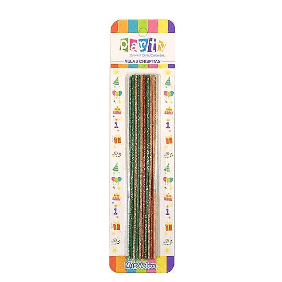 Velas chispitas glitter, el empaque contiene 18 unidades en colores surtidos, con una medida aproximada de 17cm cada unidad